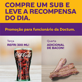 Prezados Colaboradores, Seguem anexos flyers com as promoções oferecidas pelo SUBWAY Caratinga aos funcionários da Doctum. Desconto 1, geral Desconto 2, prêmio do dia Desconto 3, leve refri