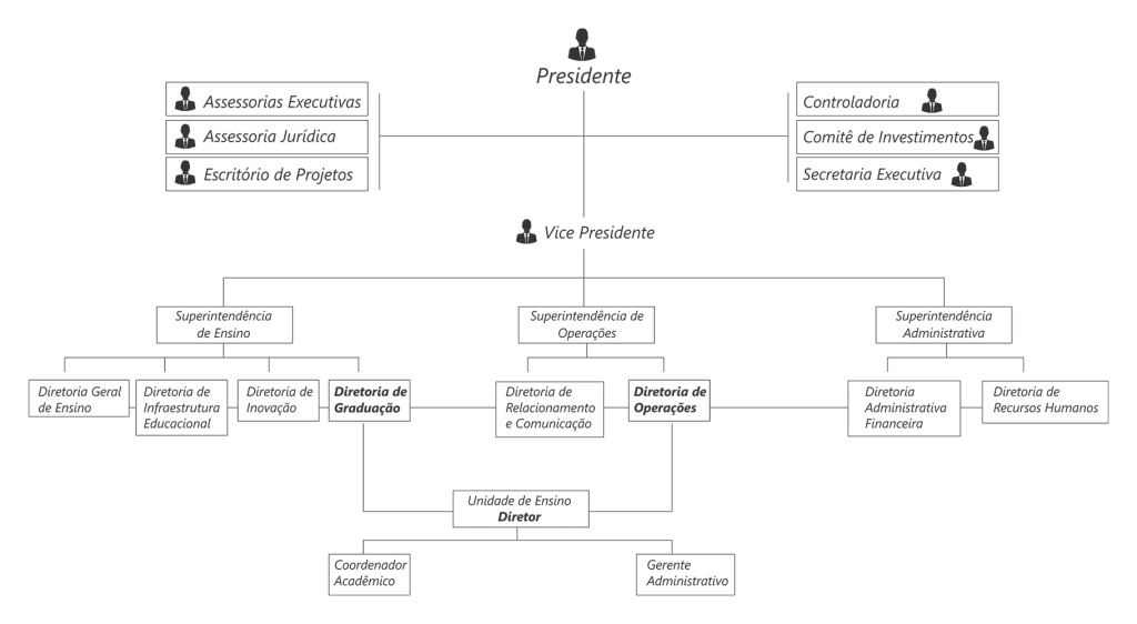 O espírito da reestruturação organizacional é promover uma integração orgânica e operacional entre as Superintendências e organizar o fluxo de comunicação com as unidades através da implantação do Comitê de Investimento e das novas Diretorias. Acompanhe no organograma as novas implantações: