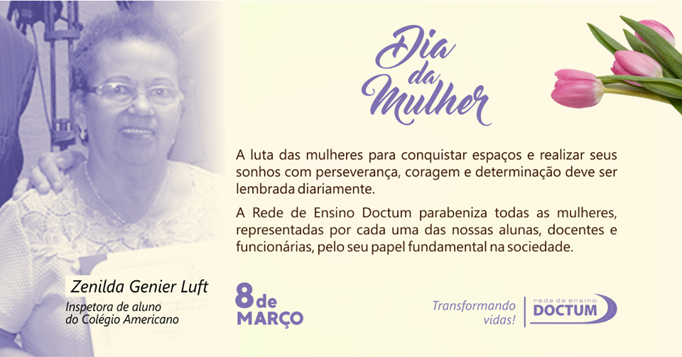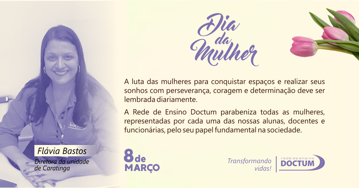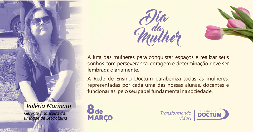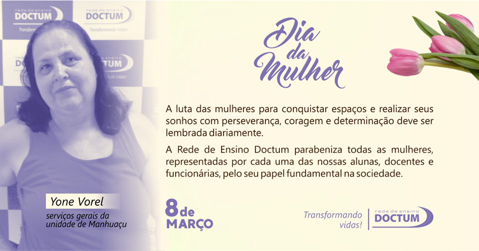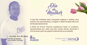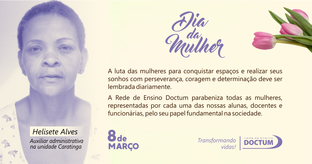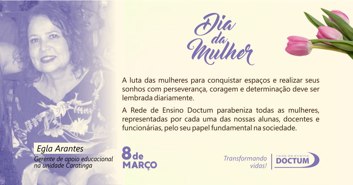 “A Doctum é um espaço significativo de luta pela ampliação dos direitos da Mulher. Conquistamos diploma universitário e um lugar no mercado de trabalho. Devemos muito a essa Instituição de Ensino, que é uma grande incentivadora do conhecimento e de sonhos” – Egla Arantes, gerente de apoio educacional da Doctum Caratinga |