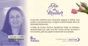 “Estar na Doctum é motivo de orgulho por ser esta instituição na qual o feminino é tratado de forma paritária com o masculino, confirmada pela presença de mulheres em postos de decisão, pela abordagem humanitária, pela oportunidade que oferece à todas mulheres e homens, sem distinção. Me orgulho por reconhecer em seus líderes valores e atributos, expressos muitas vezes em palavras, associados, pelo senso comum, ao domínio feminino como aconchego, afeto, compreensão, reconhecimento da diversidade, cuidado, assertividade” – Yolanda Coelho, diretora da Doctum João Monlevade |