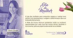 “Neste Dia Internacional da Mulher, a Doctum representa minha realização plena no âmbito pessoal e profissional. Estou na Rede há 17 anos e aqui tive a oportunidade de crescer e amadurecer como profissional e ser humano” – Liliane Xavier, assessora jurídica da Rede de Ensino Doctum |